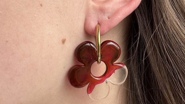 Boucles d’oreilles composées de pampilles en résine époxy et de créoles en acier inoxydable. Elles s’harmonisent parfaitement avec les vêtements proposés sur le site.