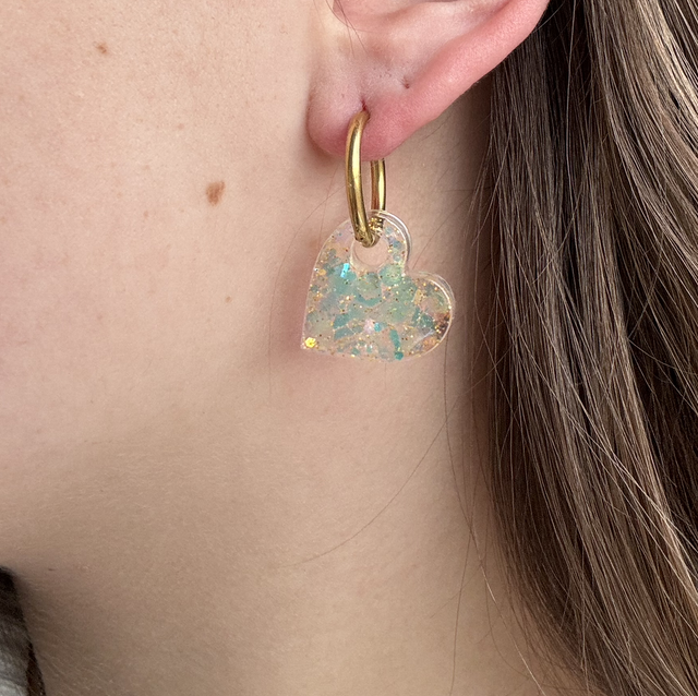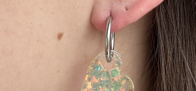 Boucles d’oreilles composées de pampilles en résine époxy et de créoles en acier inoxydable. Elles s’harmonisent parfaitement avec les vêtements proposés sur le site.