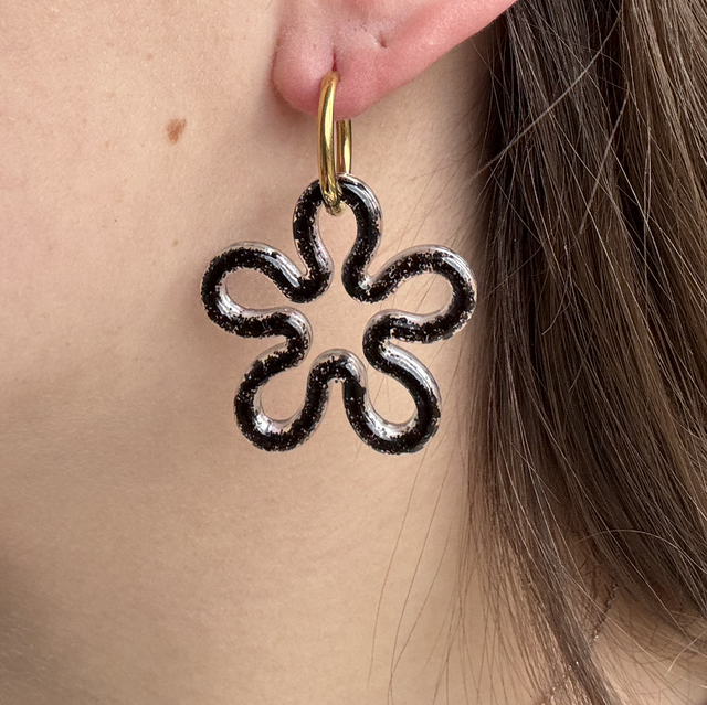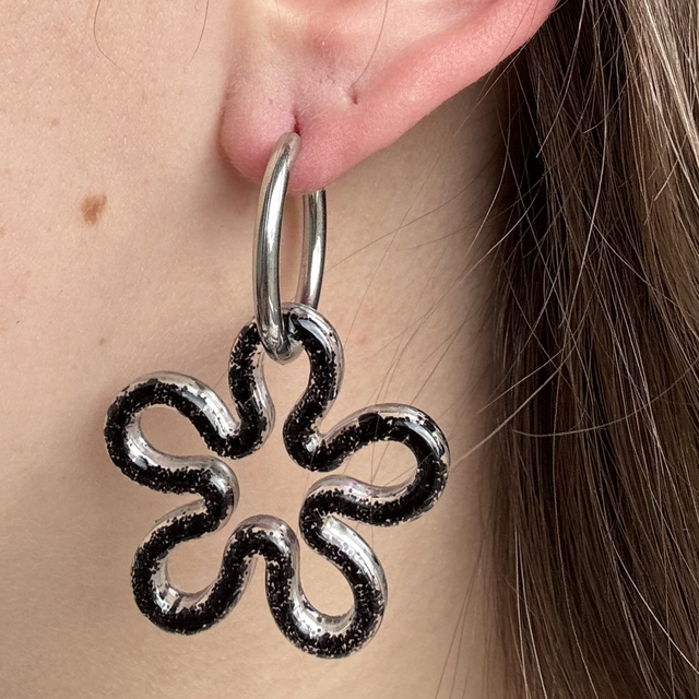 Boucles d’oreilles composées de pampilles en résine époxy et de créoles en acier inoxydable. Elles s’harmonisent parfaitement avec les vêtements proposés sur le site.